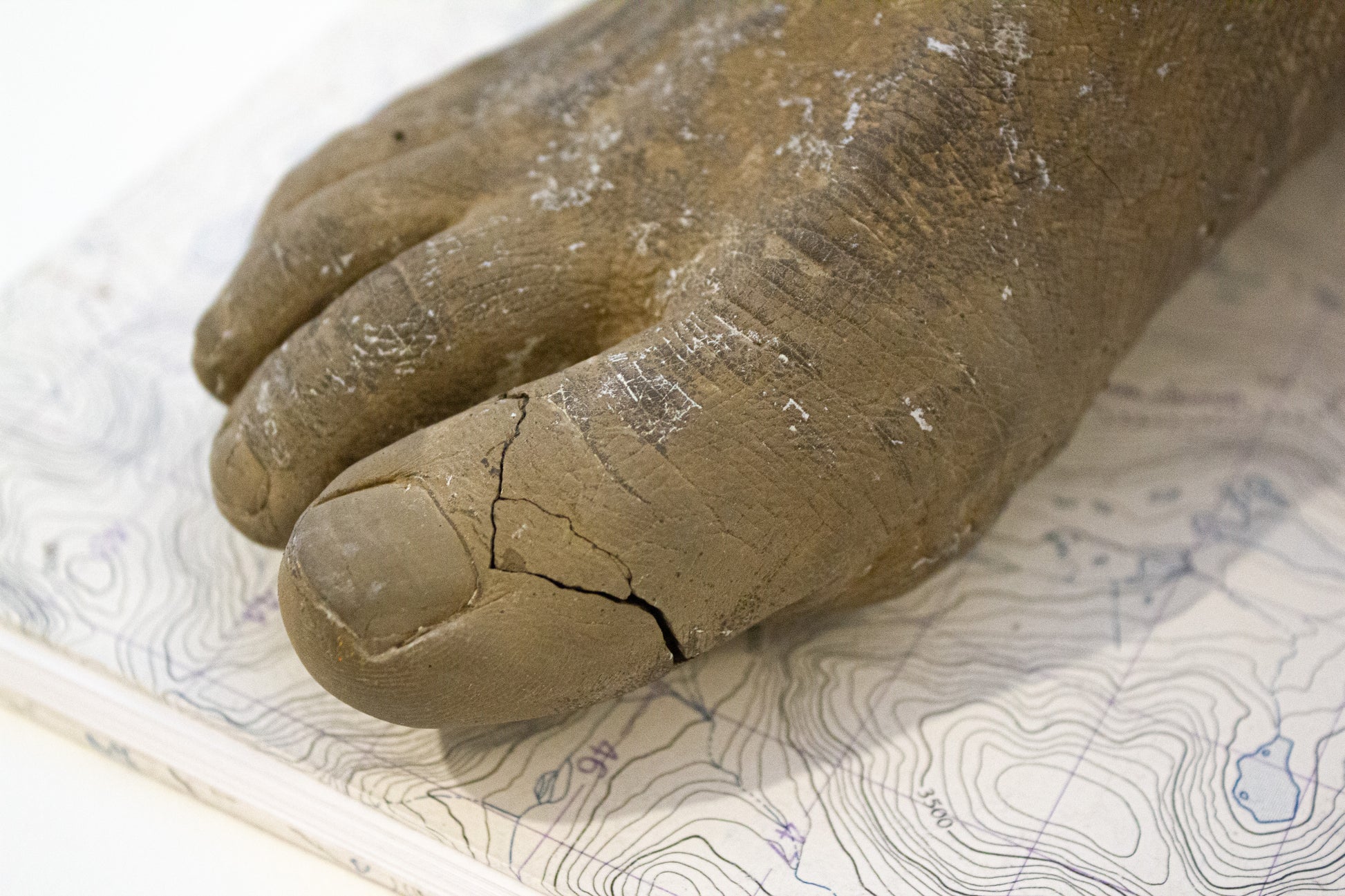 Jouant avec les changements d'échelle, Un piège à un pied du sol est une sculpture composée d'un livre et d'un moulage qui explore la relation entre le corps et le territoire et les défis liés à l'enracinement.
