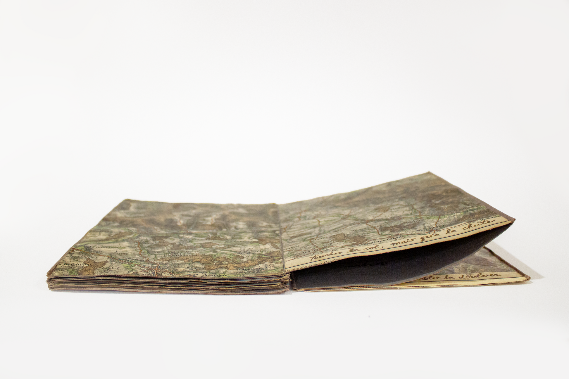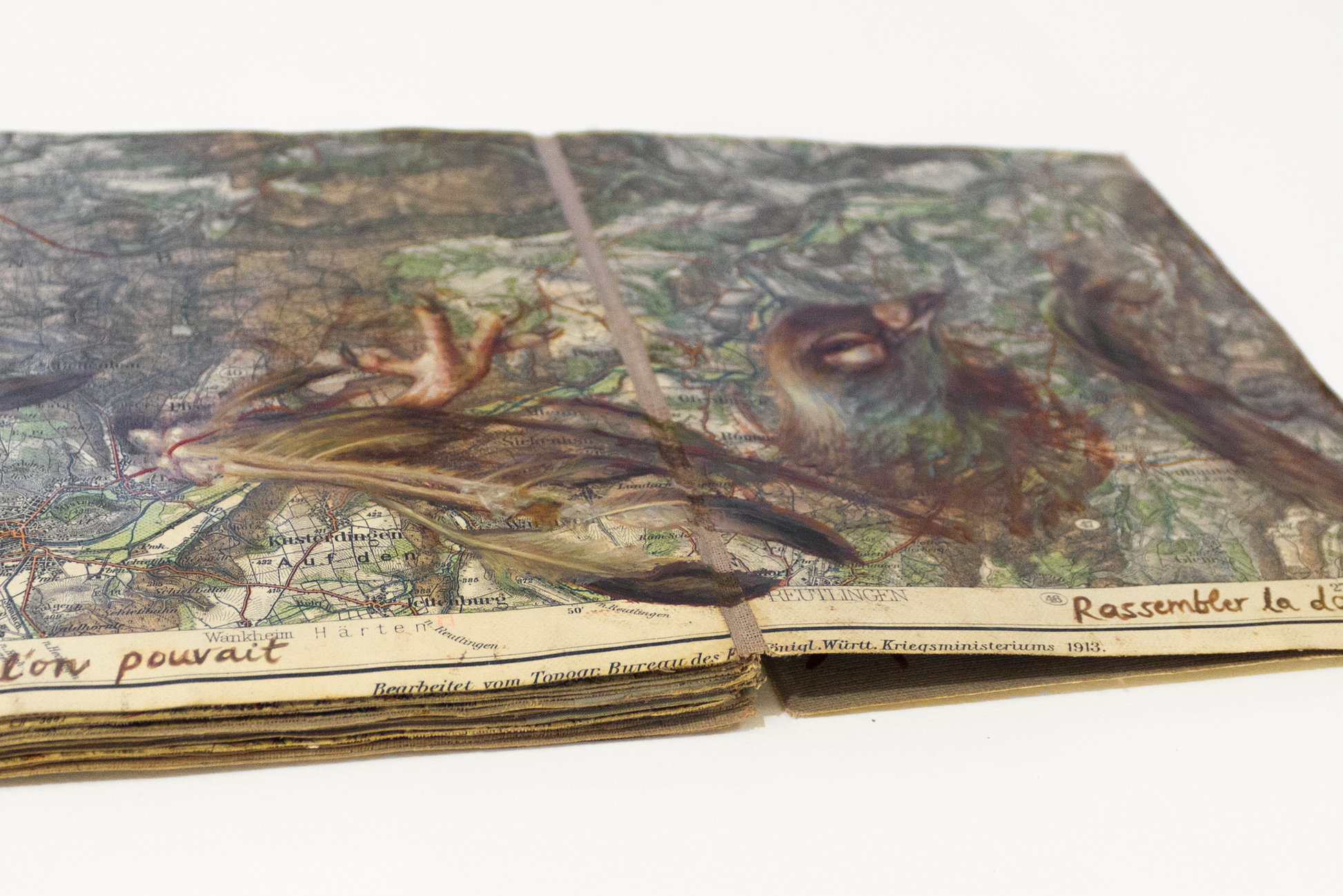 À vol d’oiseau is a artist-book depicting oil-painted birds blending into road maps, transforming cartography into a poetic meditation on inhabiting unfamiliar territory.