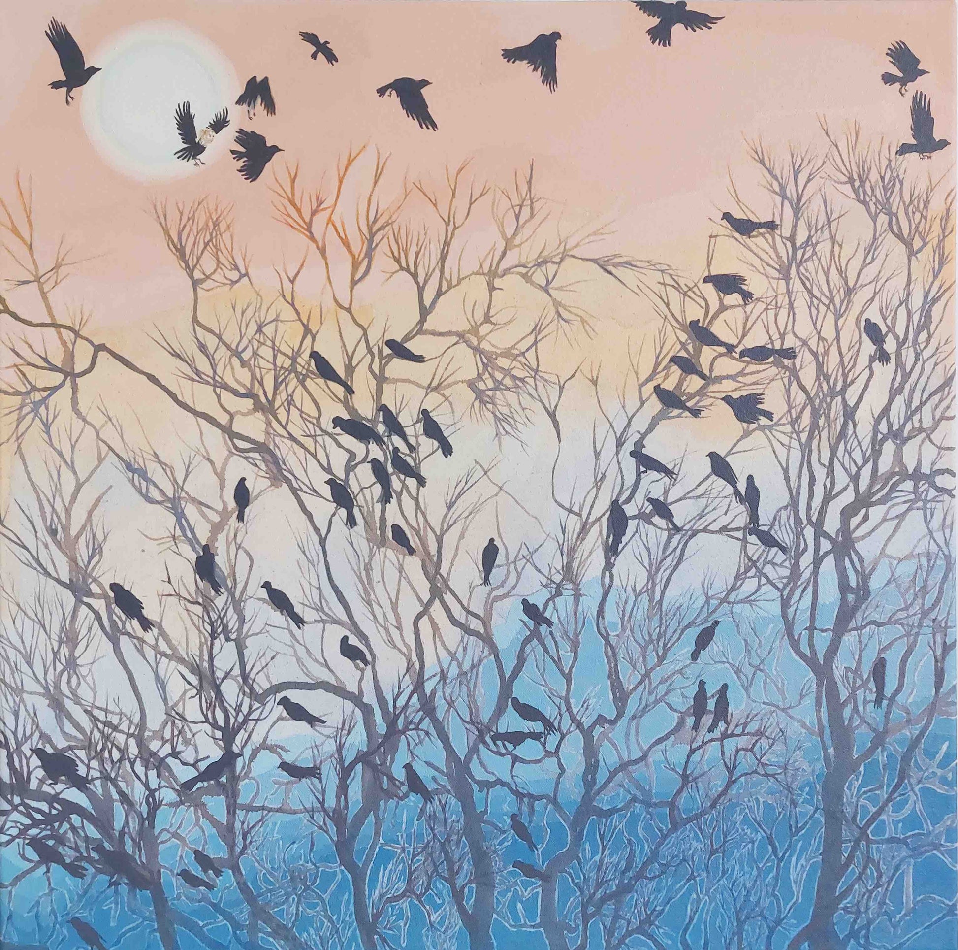 Crows gather on a dead tree, winter’s silence broken by dark wings.