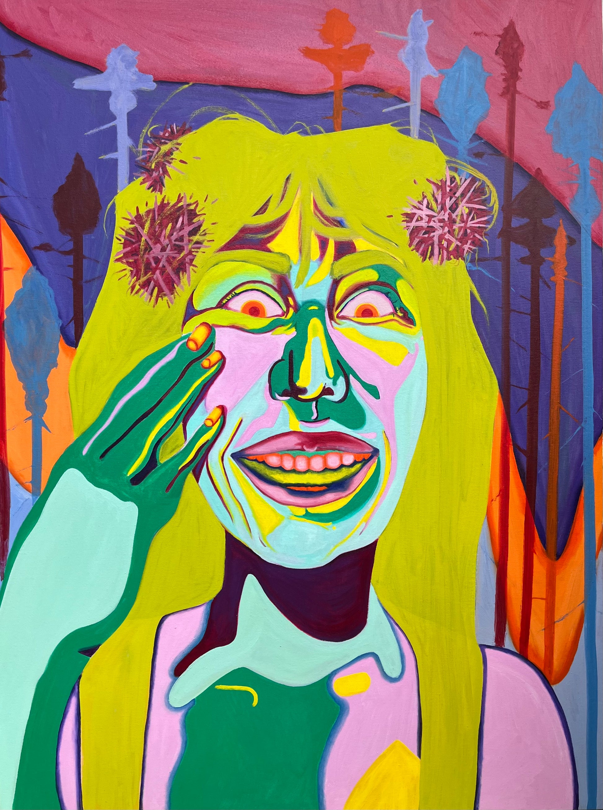 Réalisée lors de l'été 2024, chez mon grand-père. Cette année, il y avait beaucoup d'aurores boréales, même en été, ce qui a été surprenant. On aurait dit que le monde fondait autour de moi. La maison de mon grand-père étant en forêt, les noisettes sont communes. Les voir m'avait fait penser aux châtaignes que j'ai vu lors de mon voyage au Japon le mois précédant, et à la douceur du fruit qui se cache sous les pics. Cette réflection s'est avancée au martyre, à la notion d'endurer et de résister, pour peut-être pouvoir profiter du fruit, plus doux, plus tard. DESCRIPTION: Une figure faisant echo à la représentation du martyre, avec sa couronne de ronces, ici des châtaignes. À l'arrière plan la forme de pins noirs se dessine devant une aurore boréale fondante.