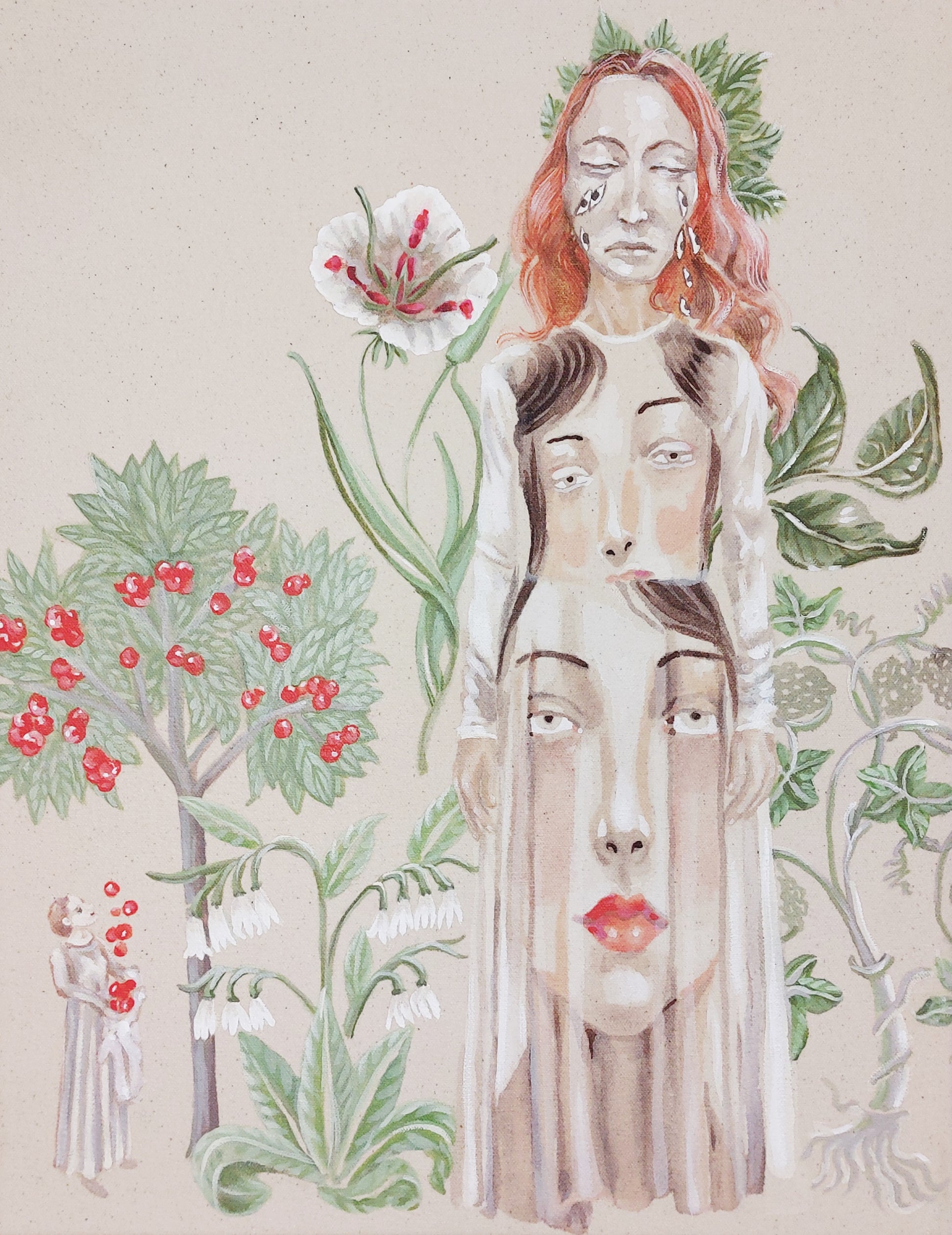 Tears fall like watching eyes; faces echo through floral medieval dreams.