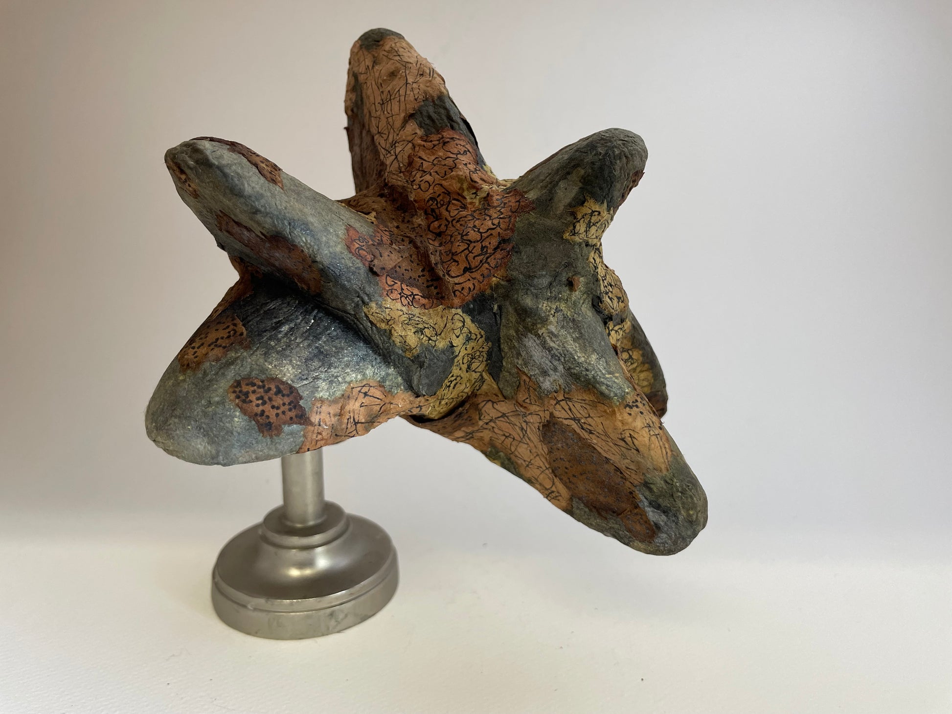 Handmade molded paper, assembled on Styrofoam, collage, natural dyes: Tagetes, Alnus serrulata (Ait), Betula alleghaniensis Britt., Solidago canadensis var.; UV-protective varnish, hardware.