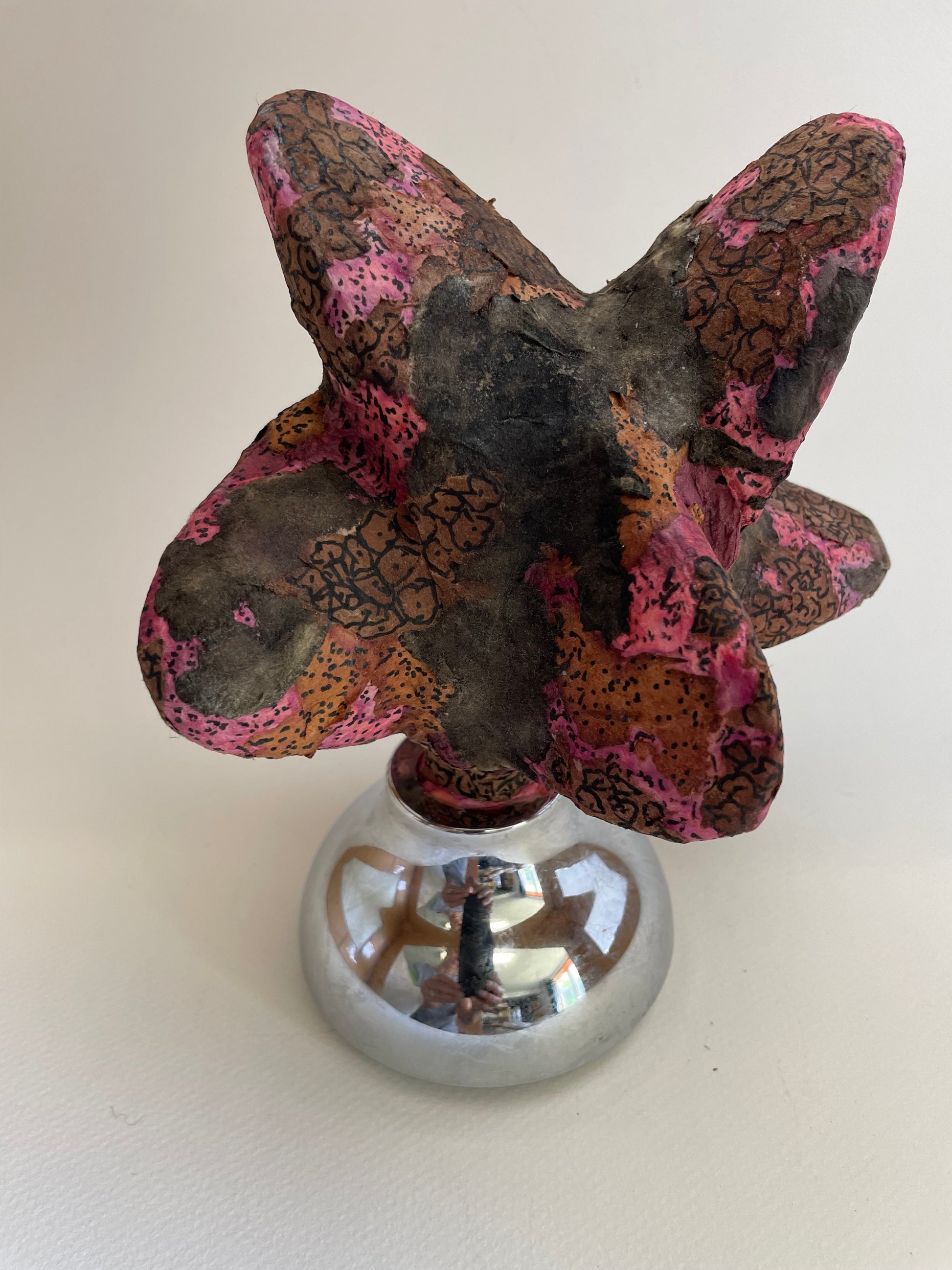 Handmade molded paper, assembled on Styrofoam, collage, natural dyes: Ulmus glabra, Tanacetum vulgare, Tsuga canadensis, Dactylopius coccus; protective varnish.